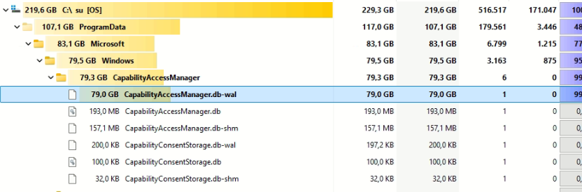 Se il file CapabilityAccessManager.db-wal è diventato troppo grande, è possibile eliminarlo
