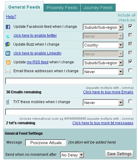 Adesso che avete “compreso” MAPS e LATITUDE, cominciate a spostarvi sul sito https://www.footprintfeed.com. Questo sito web ha il compito di prendere la posizione da Latitude e inviarla direttamente sulla bacheca del vostro Facebook. Impostate questo sito web soprattutto per la funzione “Update Facebook feed when I change” come mostrato in figura.