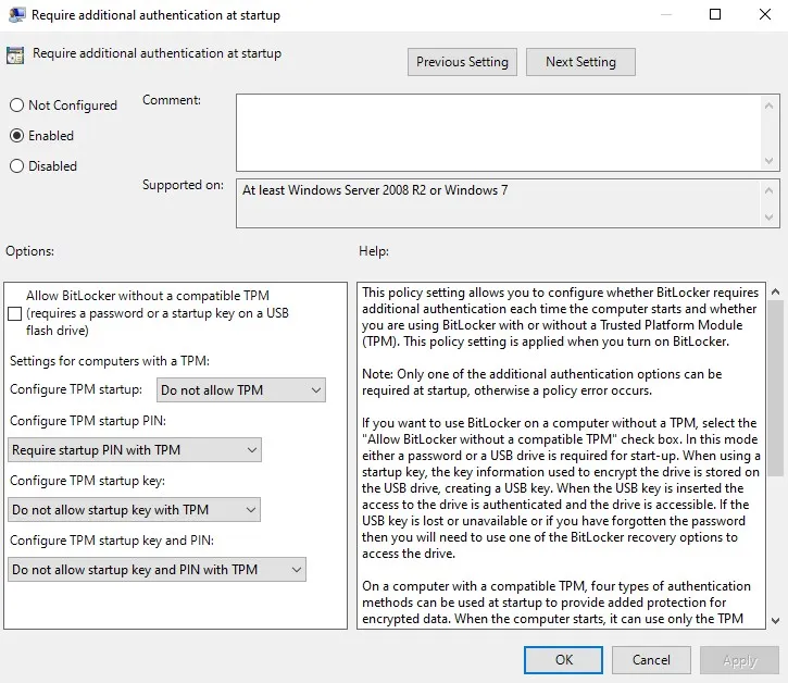 Se si riceve l’errore : “Impossibile applicare le impostazioni dei Criteri di gruppo relative alle opzioni di avvio di BitLocker perché sono in conflitto. Per ulteriori informazioni, contattare l’amministratore di sistema.”