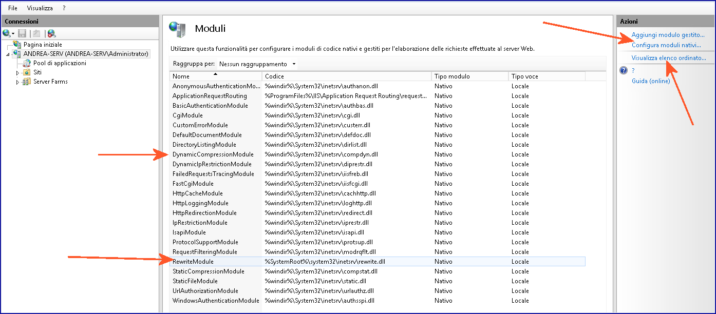 Cliccare su “Configura moduli Nativi” e selezionare DynamicCompressionModule, che “sarà trasferito” nella lista.