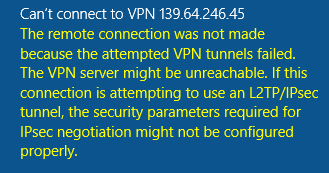 “The remote connection was not made because the attempted VPN tunnels failed. … The VPN server might be unreachable. If this connection is attempting to use an L2TP/IPsec tunnel, the security parameters required for IPsec negotiation might not be configured properly“