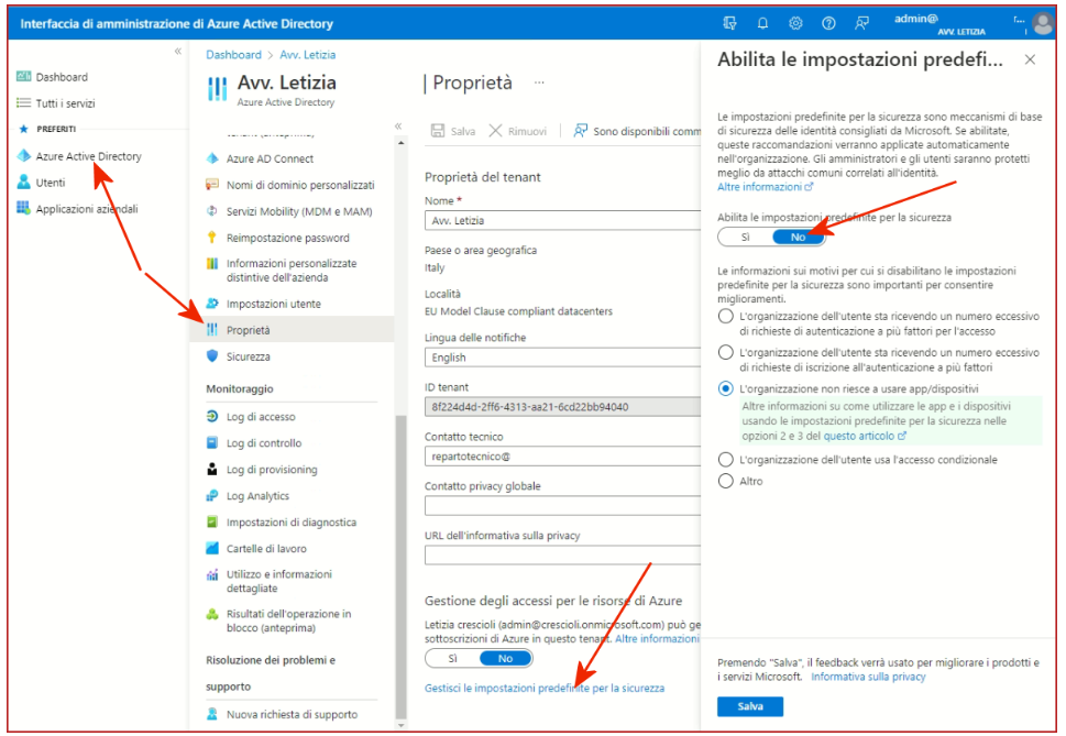 Il problema dell’accesso dipende dalle Impostazioni predefinite di sicurezza in Azure AD.